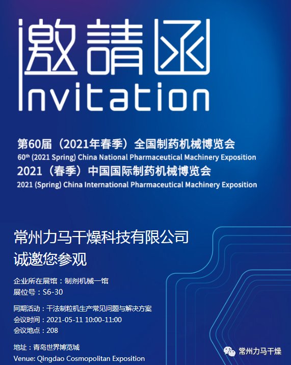 2021年5月10-12日,第60届青岛药机展会在青岛国际博览中心举行。常州力马在制剂机械一馆S6-30 展位,特邀著名教授和资深工程师为你答疑解难、赠书启智。